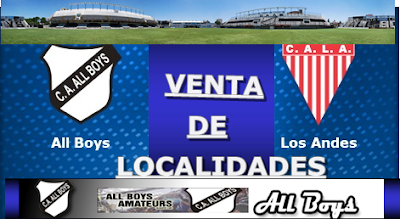 El Departamento de Prensa del Club Atlético All Boys, informa los precios de las distintas entradas para el partido a disputarse este lunes entre All Boys y Los Andes. En este cotejo, los SOCIOS que vayan a la popular de la Calle Chivilcoy para ingresar deberán presentar su carnet con cuota de MARZO 2017 paga y abonar un bono obligatorio de $ 50 mientras que los NO SOCIOS deberán abonar un bono obligatorio de $ 70 para ir a dicha tribuna.